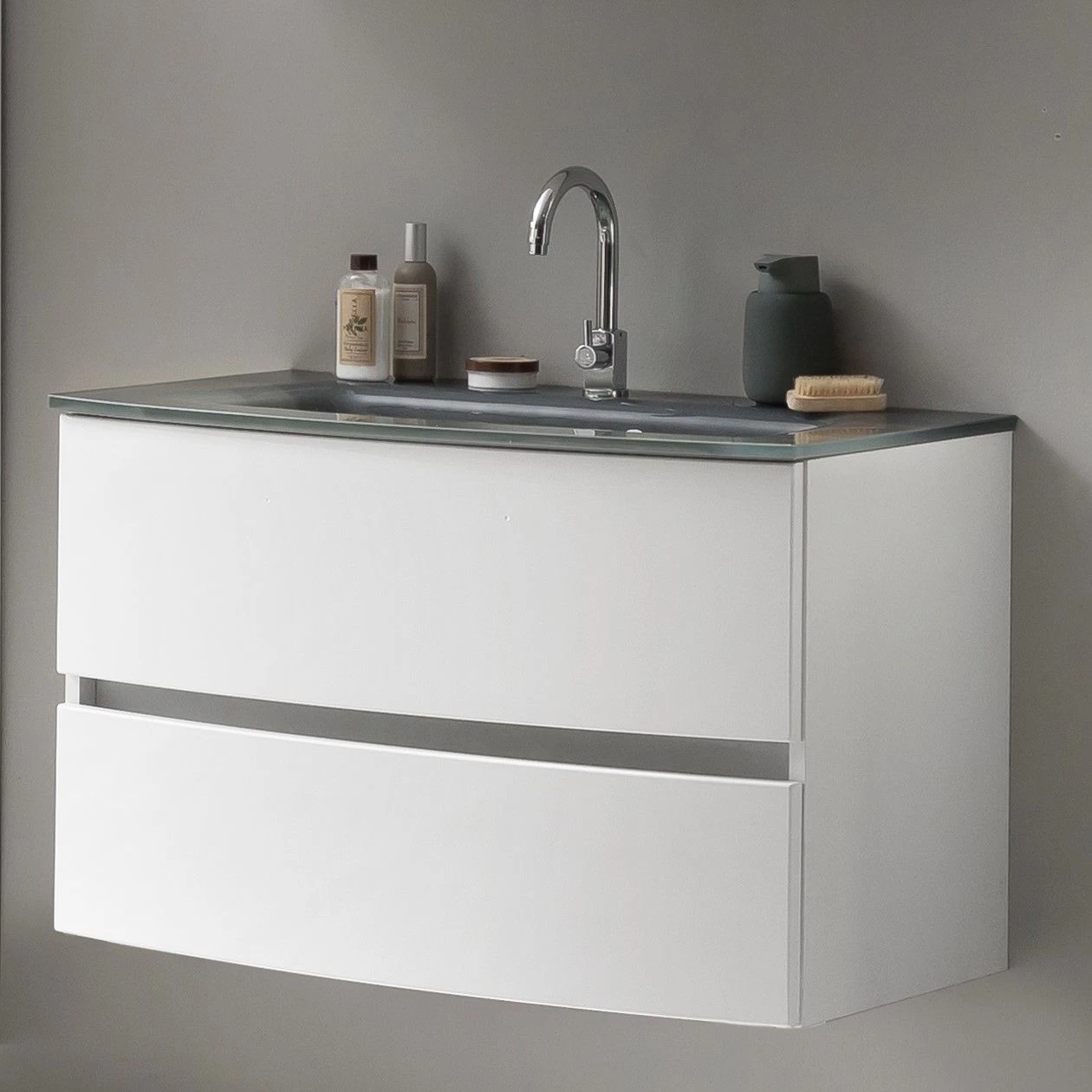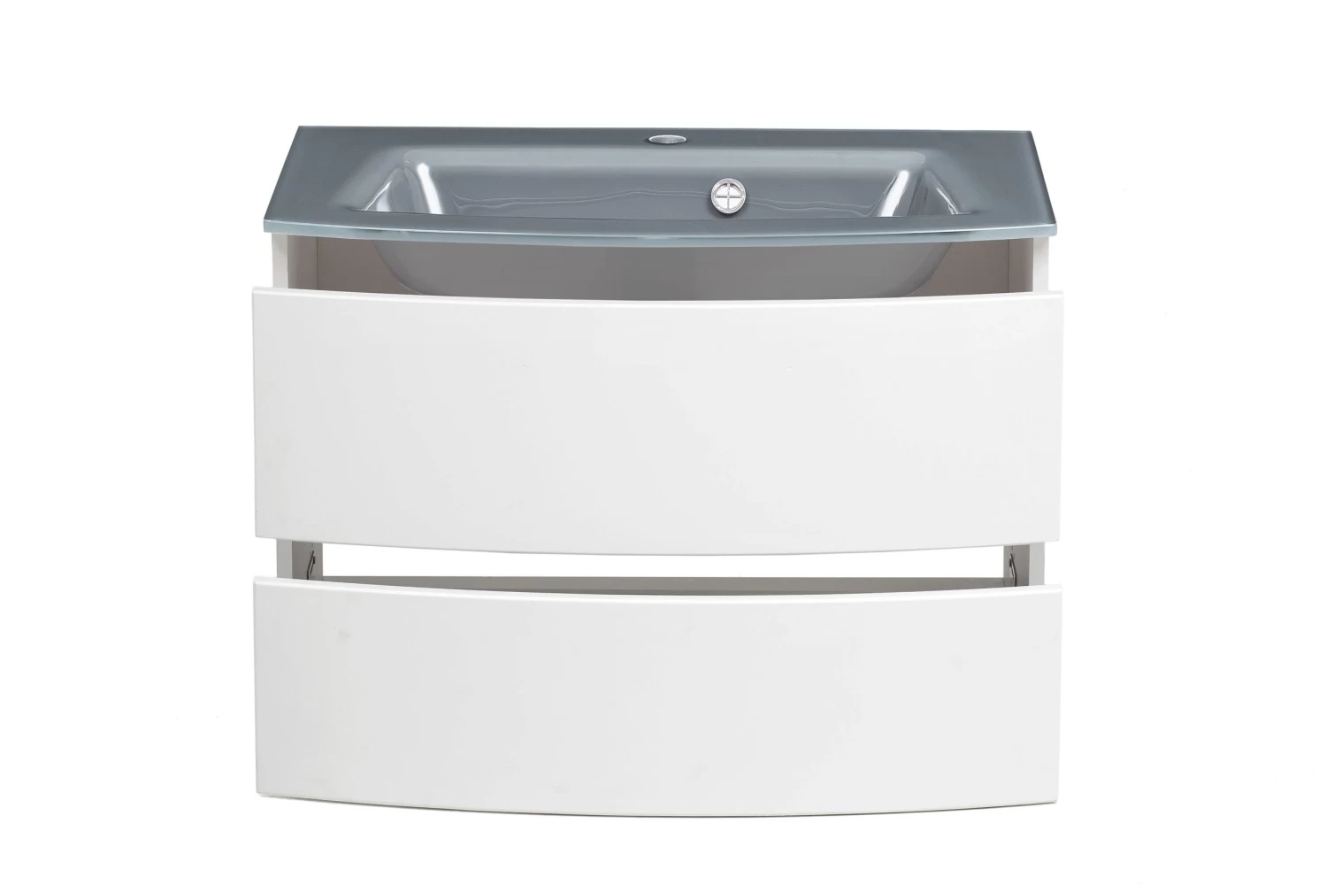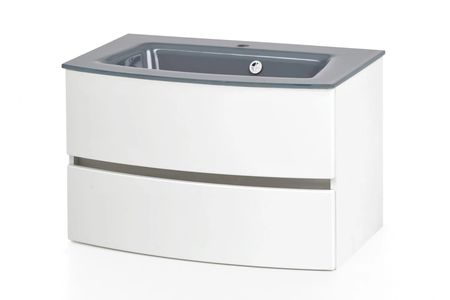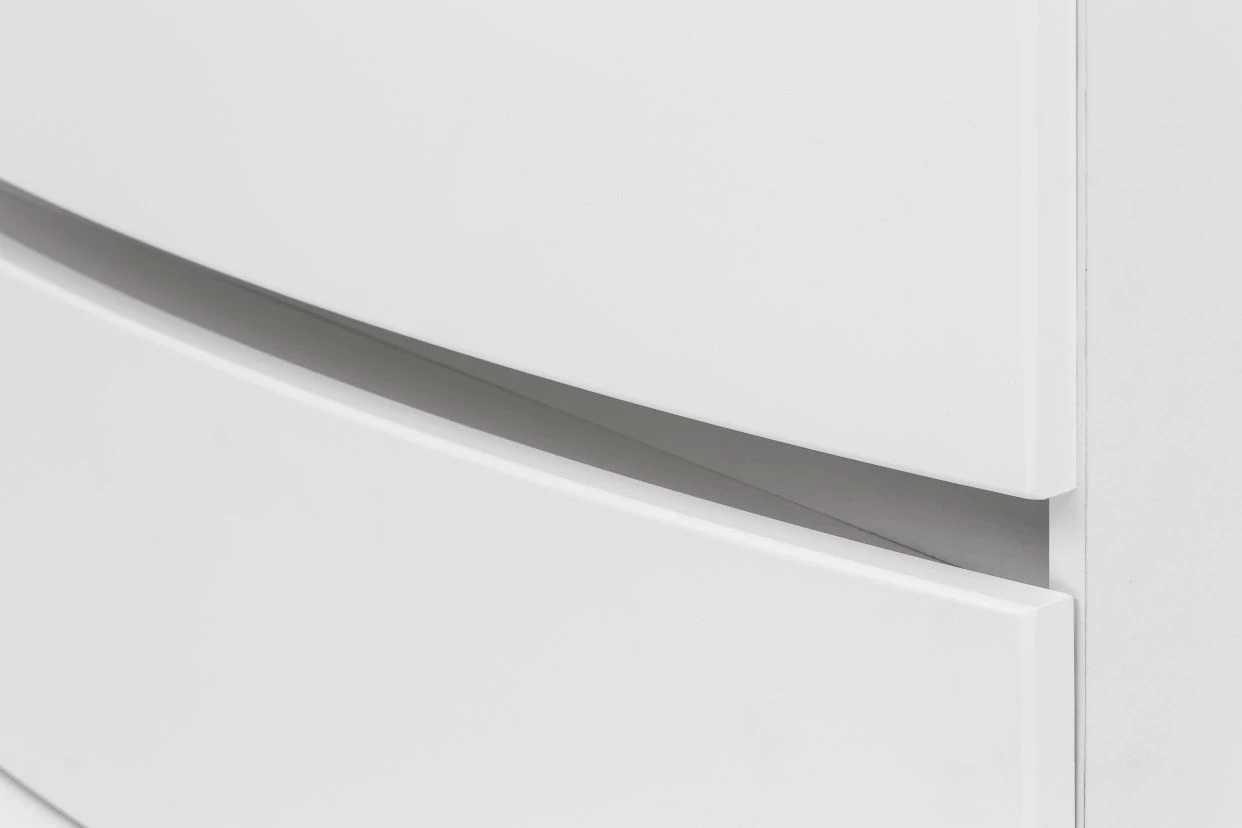 Met de meubelen van de Kornel-collectie kan je eindeloos combineren om zo jouw ideale badkamer samen te stellen. Dit witte wastafelmeubel is 80 cm breed en is gemaakt van gemelamineerde spaanplaat en MDF. Het meubel is uitgerust met 2 ruime, gebogen softclose lades met een matwitte afwerking en met een grijze wastafel. Dankzij haar greeploze design draagt wastafelmeubel Kornel bij tot een moderne en rustgevende sfeer in de badkamer.