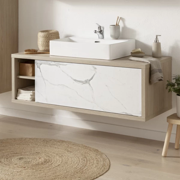 Wastafelmeubel Latima 123cm Met Wastafel En Opberglade – Eik/marmer
