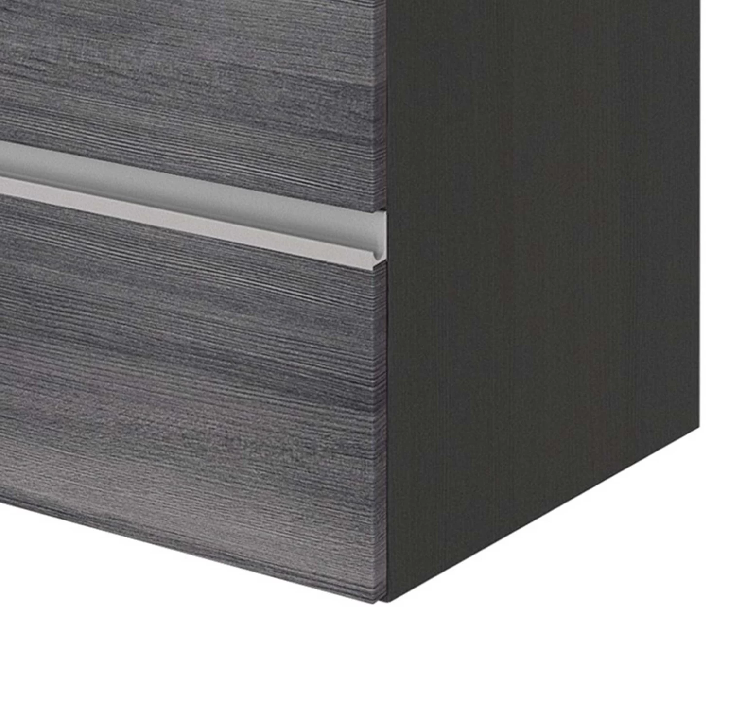 Wastafelmeubel Lotuk, uitgerust met 4 lades. Meubel samengesteld uit gemelamineerde spaanplaat in grafietgrijs en een voorkant in zilvergrijze MDF met eikdecor.