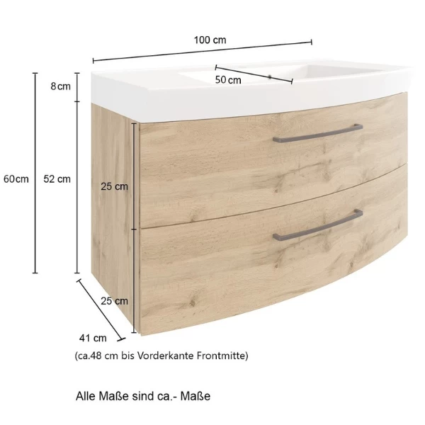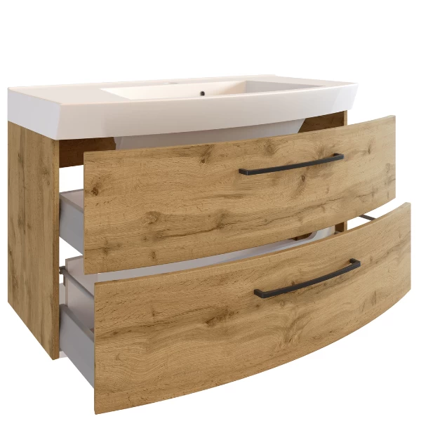 Wastafelmeubel Malvo 100x50x59cm uit spaanplaat en MDF. Met twee lades en inclusief wastafel. Afwerking in melamine in eikdecor en zwarte handgrepen.Â