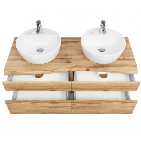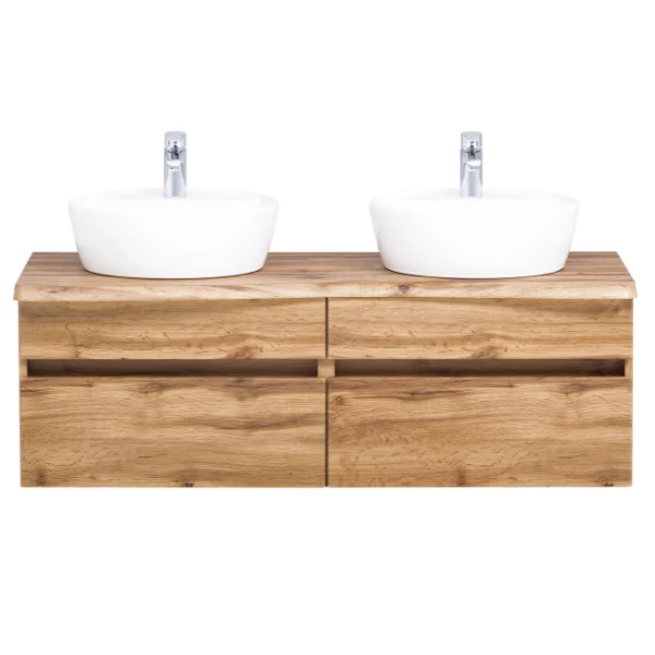 Dubbel wastafelmeubel Vikas 121x47x55cm uit spaanplaat en MDF. Met vier opberglades en twee wastafels uit keramiek. Afgewerkt met melamine in eiklook.