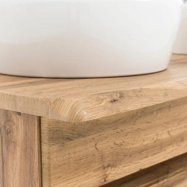 De collectie Vikas combineert een minimalistisch ontwerp met een natuurlijke uitstraling. Dit wastafelmeubel is gemaakt uit spaanplaat en MDF en afgewerkt met melamine in eikdecor. Het strakke ontwerp en de houtlook zorgen voor een pure look, terwijl de organische vorm van het tafelblad het natuurlijk karakter versterkt. De wastafels uit keramiek zijn inbegrepen. Dankzij de opberglades kun je allerlei badkamerspullen netjes opbergen. Deze collectie bestaat ook in een afwerking in antraciet. Bekijk het volledige gamma op onze website.