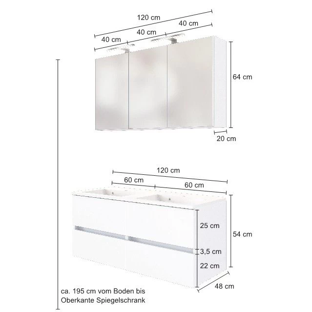 Wastafelmeubelset Brama, samengesteld uit een wastafelmeubel met 4 lades en een spiegelkast met 3 deuren. De set is gemaakt uit gemelamineerde spaanplaat en een voorkant in matte MDF.