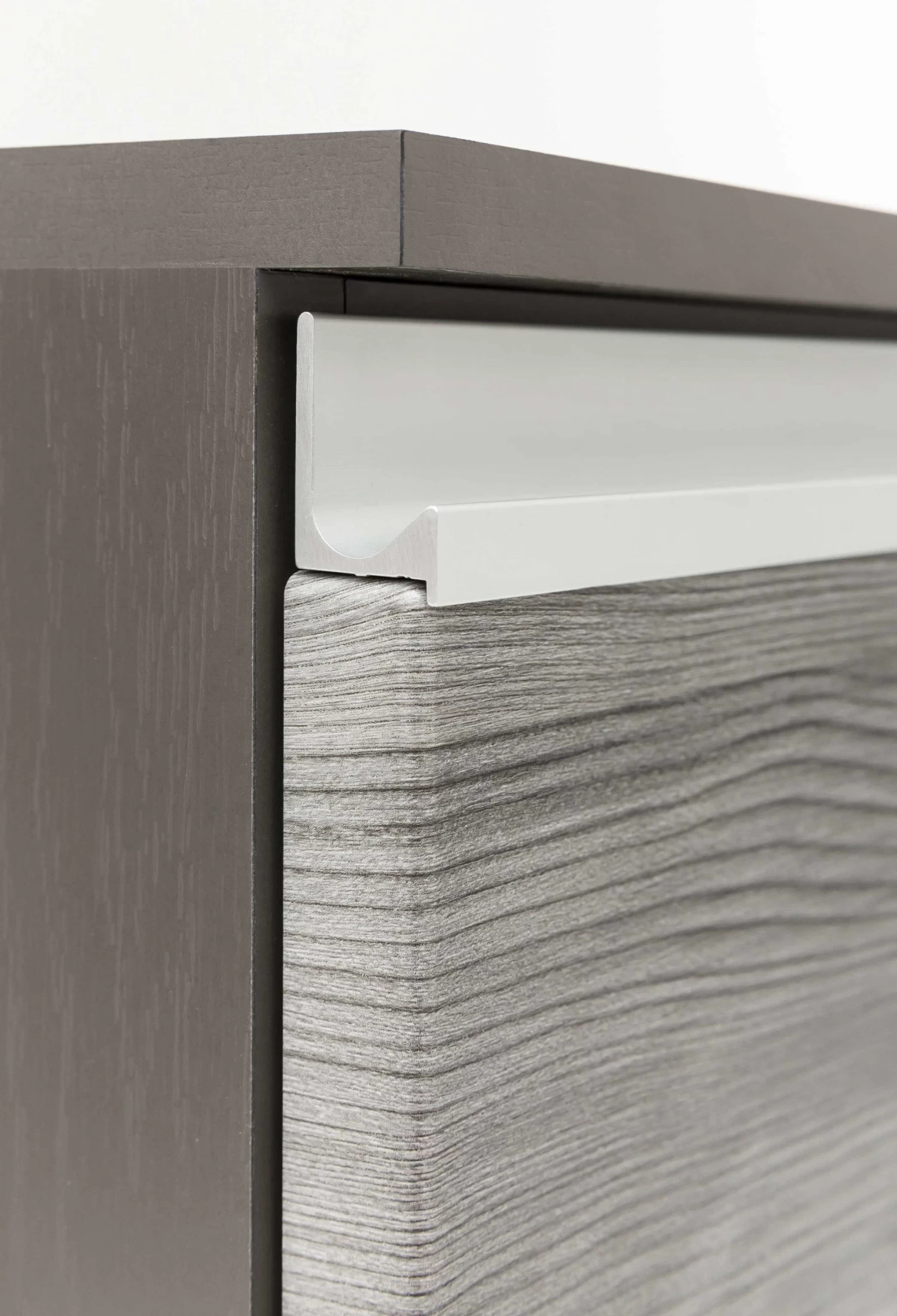 Wastafelonderkast Lotuk in zilvergrijs eikdecor, met 1 klep en 1 lade. Meubel wordt geleverd inclusief 4 pootjes.