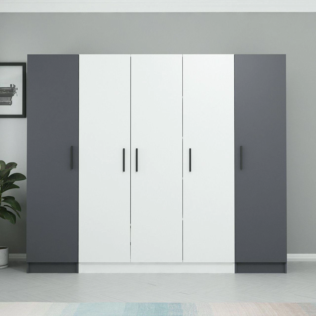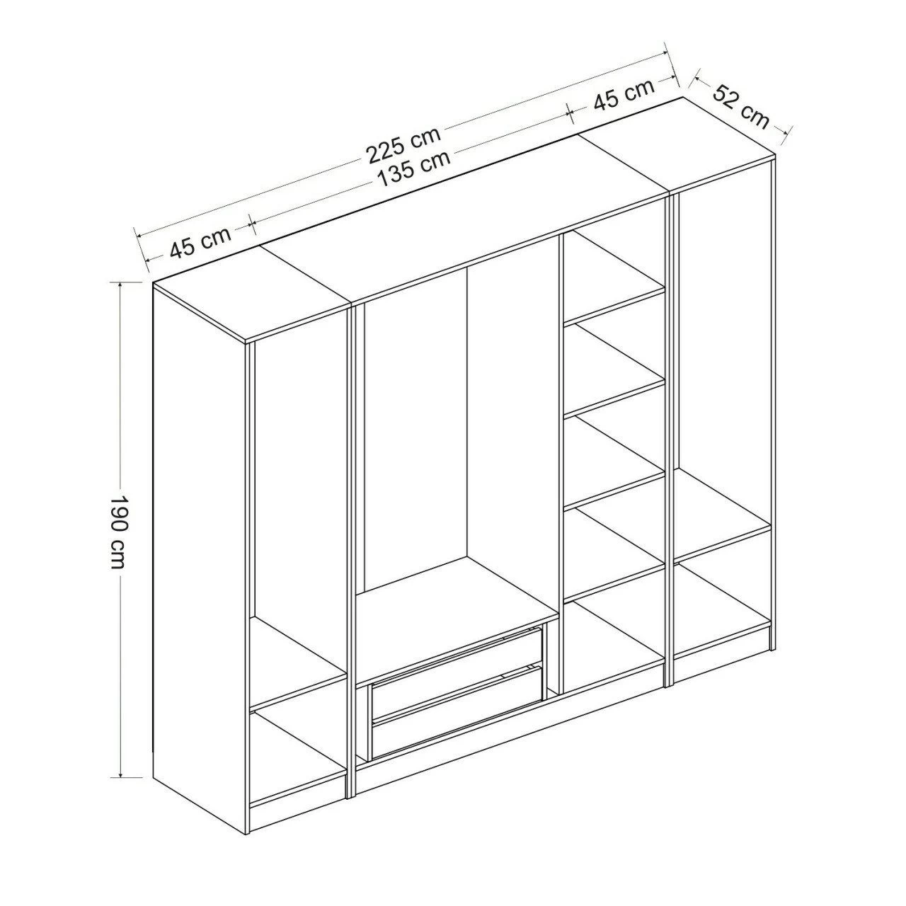 Met een breedte van 225 cm, een hoogte van 190 cm en een diepte van 52 cm biedt deze kast voldoende opbergruimte voor al je spullen. Het ruime interieur is voorzien van talloze legplanken, zodat je je kleding, schoenen en andere benodigdheden netjes kunt ordenen en uitstallen.